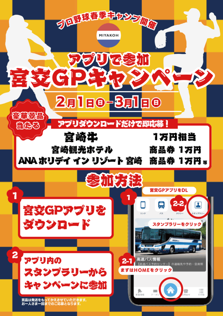 集めるスタンプは1つだけ!以下の配置場所に掲示された応募用QRコードを「宮交GPアプリ」のスタンプラリー機能を使って読み込んでください!